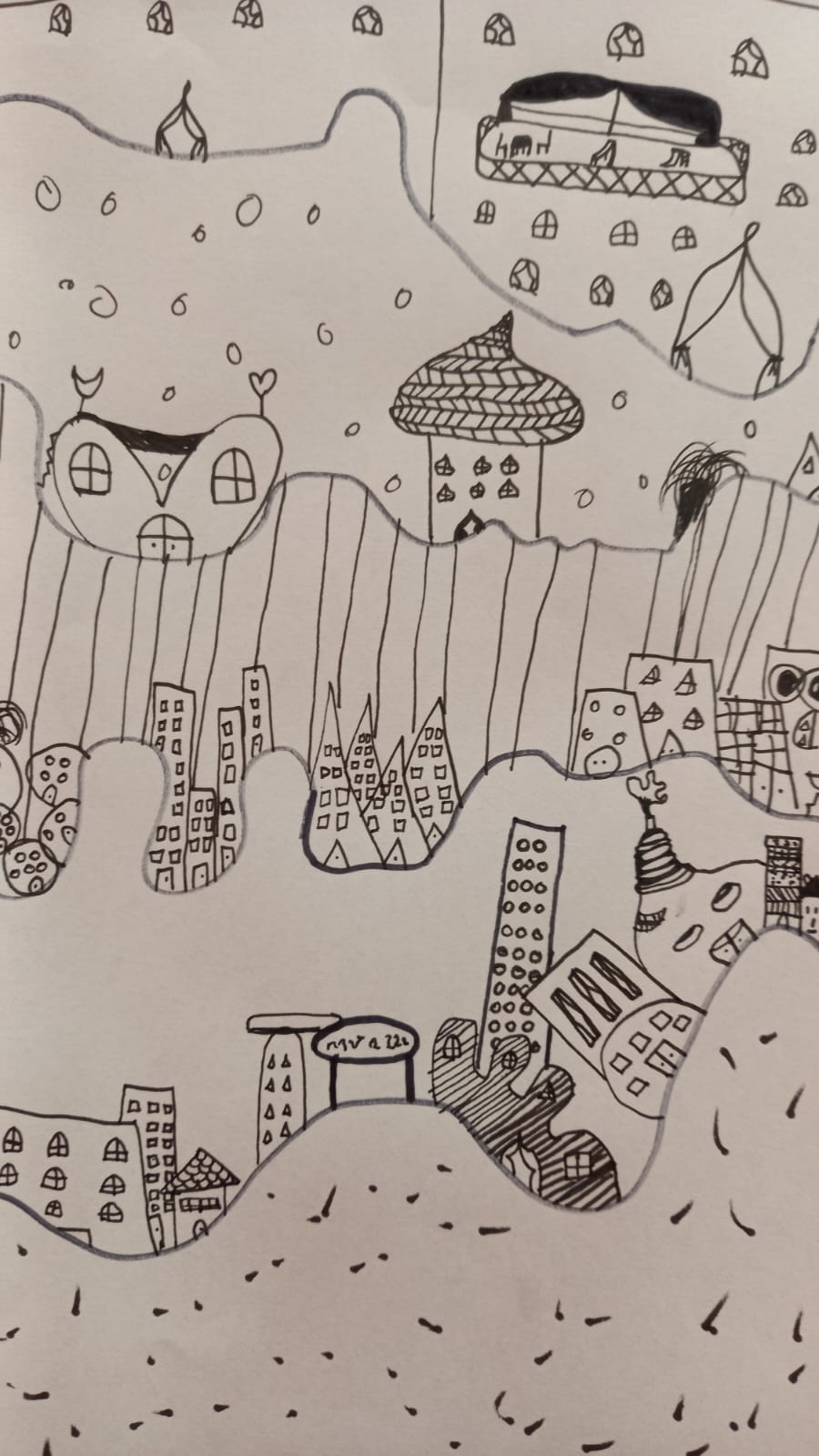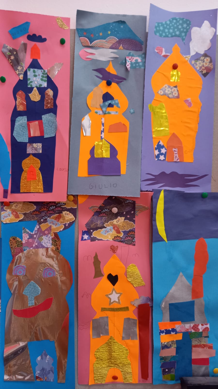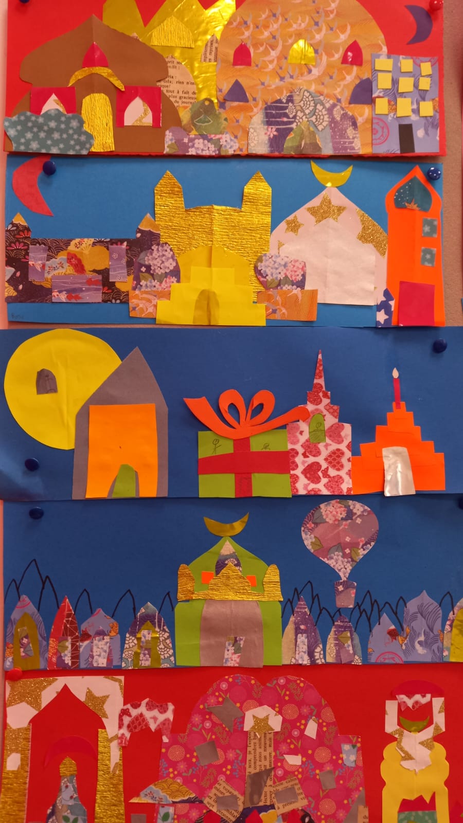 Collages sur le thème de l’Orient et graphismes de maisons au marqueur réalisés par les élèves de l’atelier arts plastiques