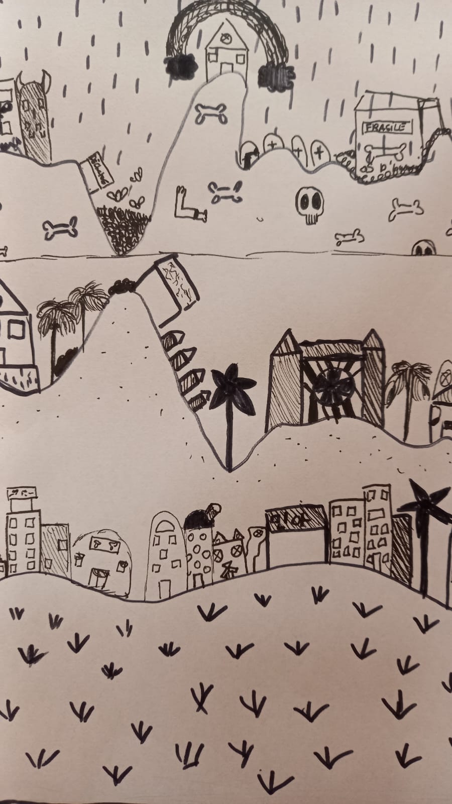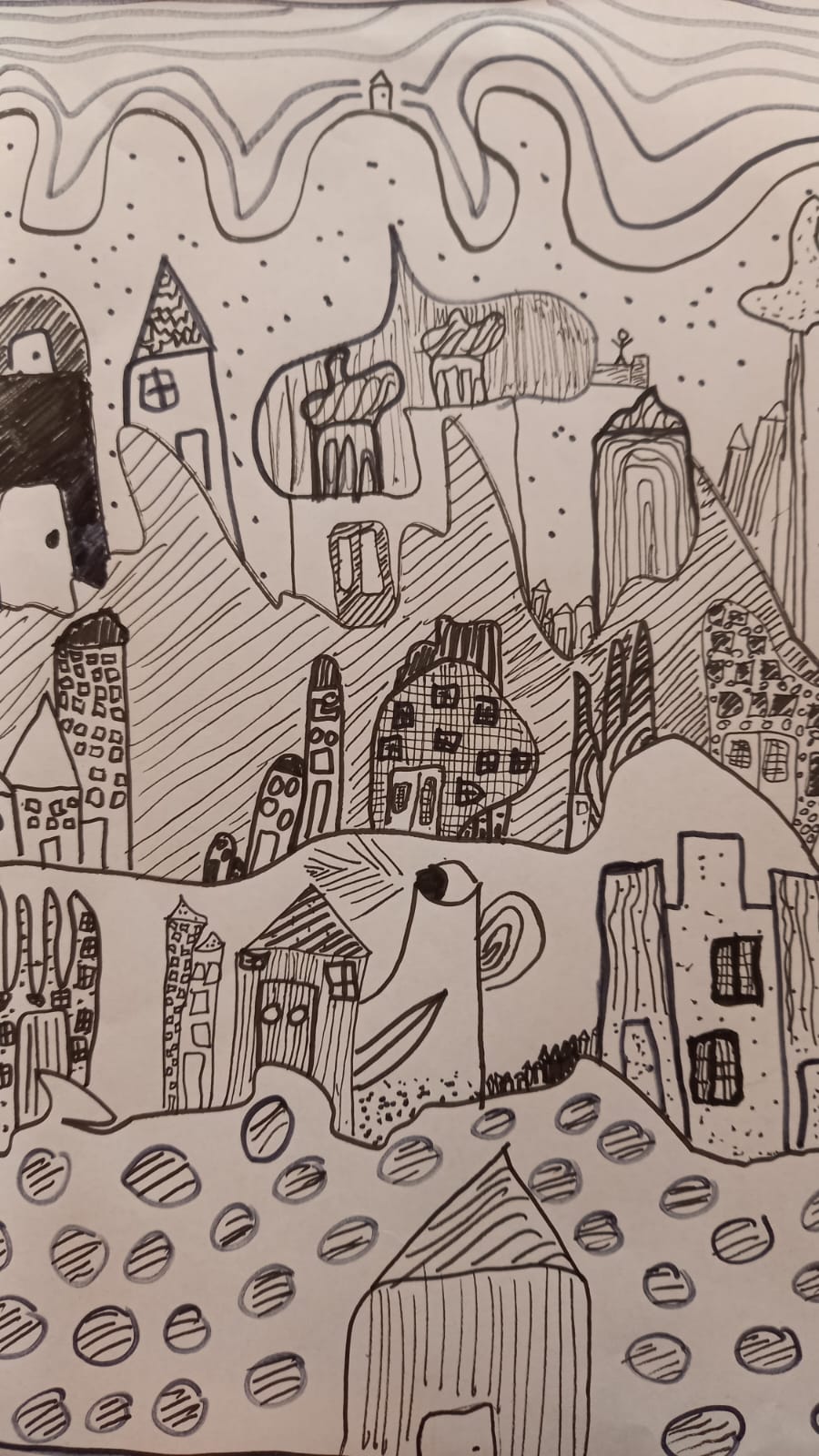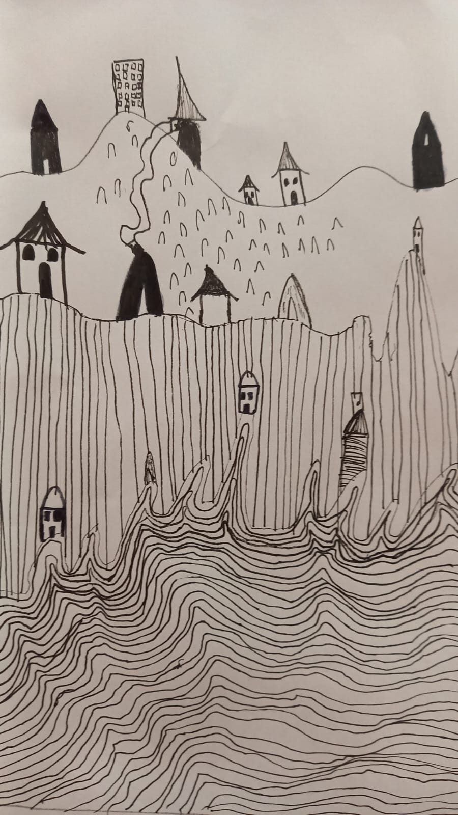 Collages sur le thème de l’Orient et graphismes de maisons au marqueur réalisés par les élèves de l’atelier arts plastiques